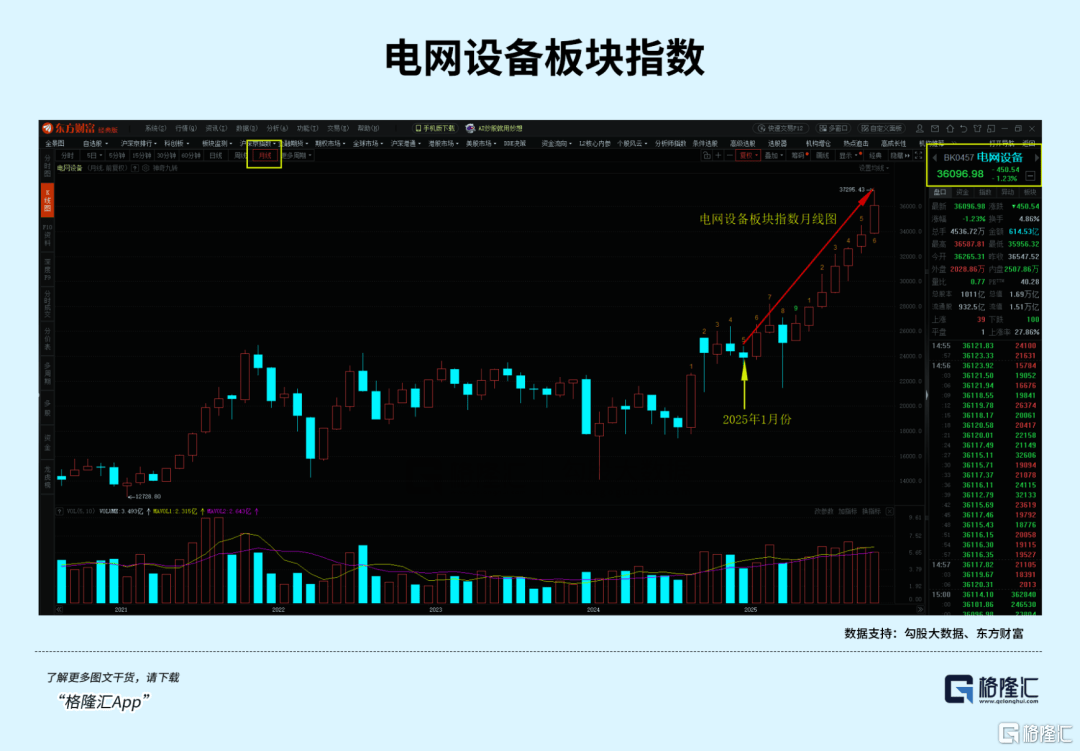 如图,手艺层面阐发,电网设备板块指数从本年起头月线级别呈现单边趋向上涨,成交量也呈现暖和放大(未爆量),量价齐升,常稳健且具有持续性的走势。