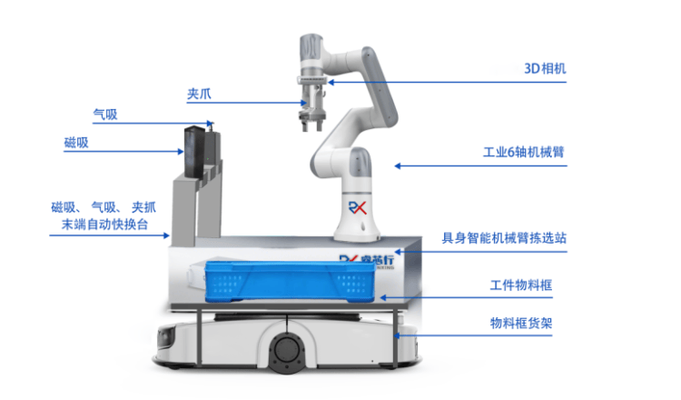 此外,针对更复杂的挑撰场景,睿芯行又初创了可及时切换机械手臂结尾的具身智能挑撰坐,还给具身智能付与了“好眼神”:该方案通过视觉或消息交互,识别多种形态的零件,并及时选择分歧的机械手臂结尾施行器(如夹爪、气吸、磁吸、工致手等)进行高效抓取,完成无人化挑撰工做。
